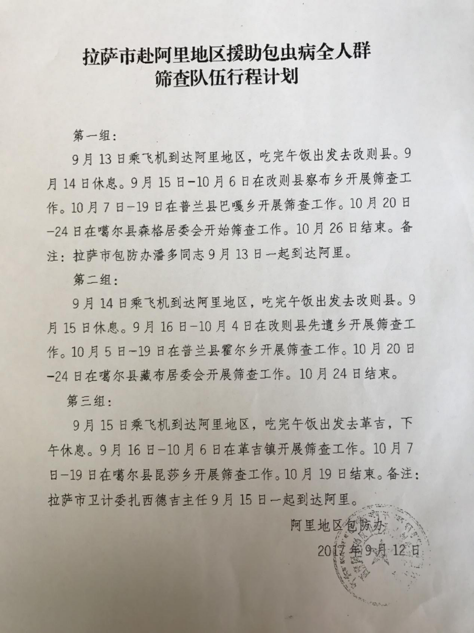 經(jīng)了解,此次包蟲篩查工作,拉薩市衛(wèi)計委邀請并組織3支共18人的醫(yī)療小分隊。我院是第三組,分在阿里的革吉鎮(zhèn)和噶爾縣昆莎鄉(xiāng)兩個篩查點,共將篩查3564人。另外兩組分別是改則縣察布鄉(xiāng)(2650人)和先遣鄉(xiāng)(2050人)。從分配工作計劃上看我組分配的篩查人員最多,人員也比較分散,給工作增加了難度,小組預計將9月17日~10月19日完成篩查工作。