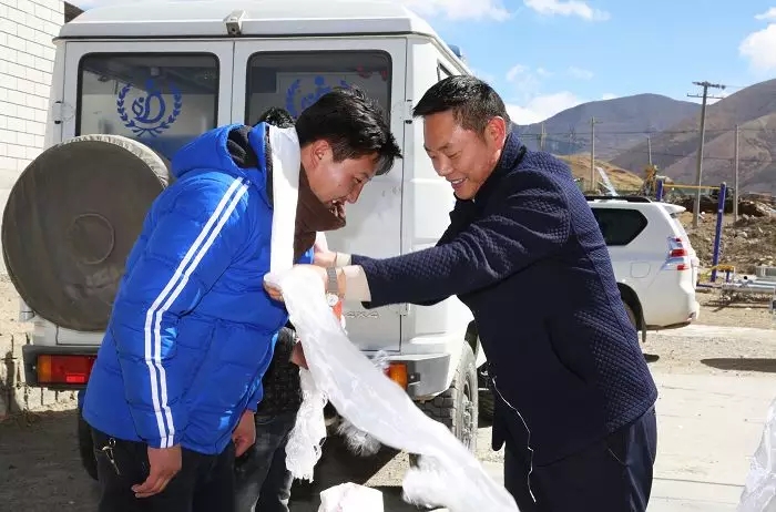 公司黨委副書(shū)記、副總經(jīng)理陳彬?yàn)榧卫杩h夏瑪鄉(xiāng)一村村民獻(xiàn)上哈達(dá)